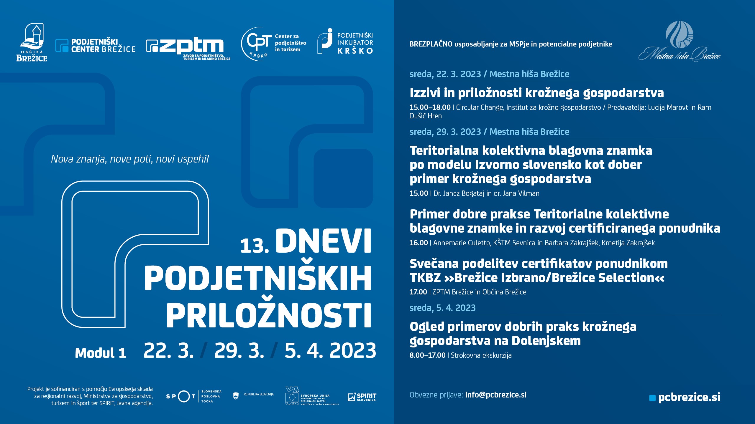Več o posameznem usposabljanju in o programu strokovne ekskurzije najdete na spletni strani ZPTM Brežice: https://www.pcbrezice.si/dogodki/dnevi-podjetniskih-priloznosti/13-dnevi-podjetniskih-priloznosti