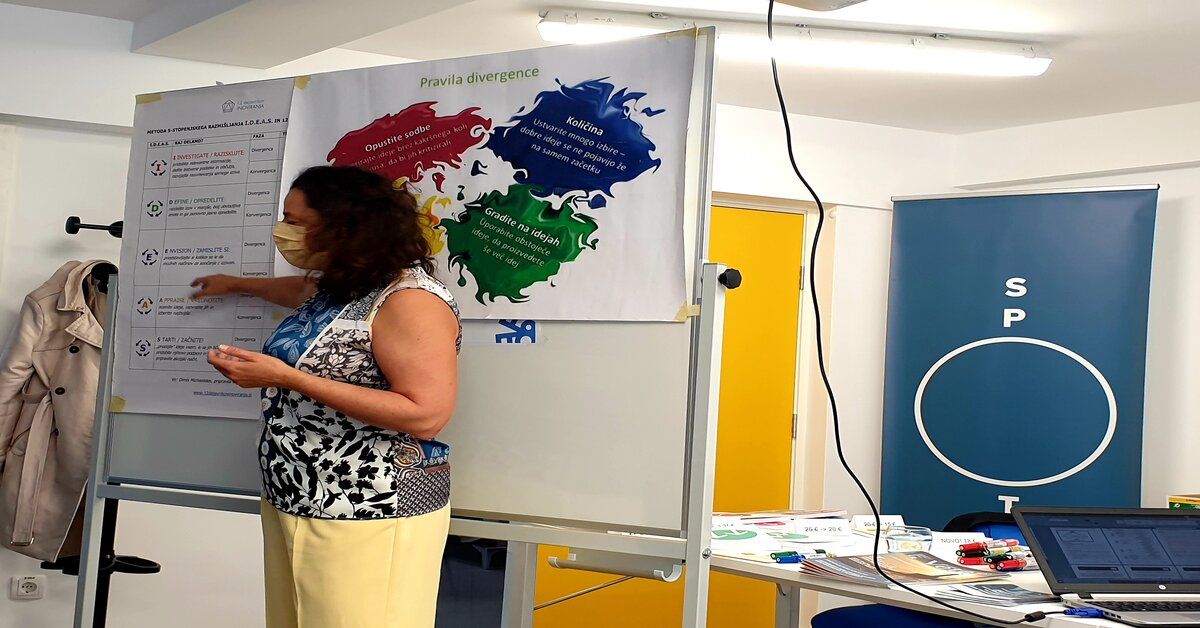 Po mreženju ob kavici in prigrizku na ploščadi pred inkubatorjem je sledila krajša, vendar zanimiva delavnica na tematiko kreativnosti oz. tehnikah kreiranja idej. Delavnico je vodila mag. Nastja Mulej, licencirana trenerka de Bonovih metod razmišljanja ter moderatorka.